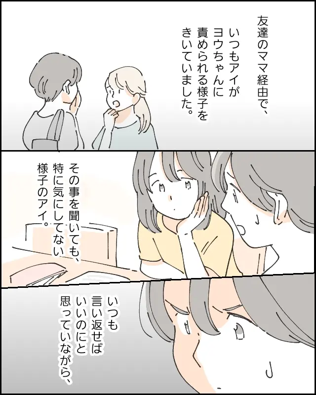 私はママ友経由で、いつもアイがヨウちゃんに責められる様子を聞いていました。その事を聞いても、特に気にしてない様子のアイ。私はいつも言い返せばいいのにと思っていながら、