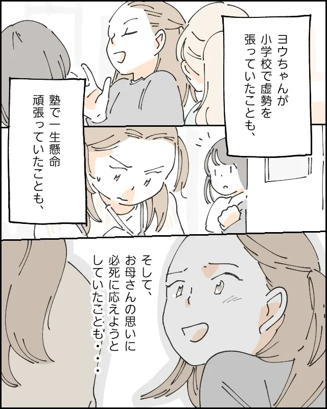 ヨウちゃんが小学校で虚勢を張っていたことも、塾で一生懸命頑張っていたことも、そしてお母さん思いに必死に応えようとしていたことも・・