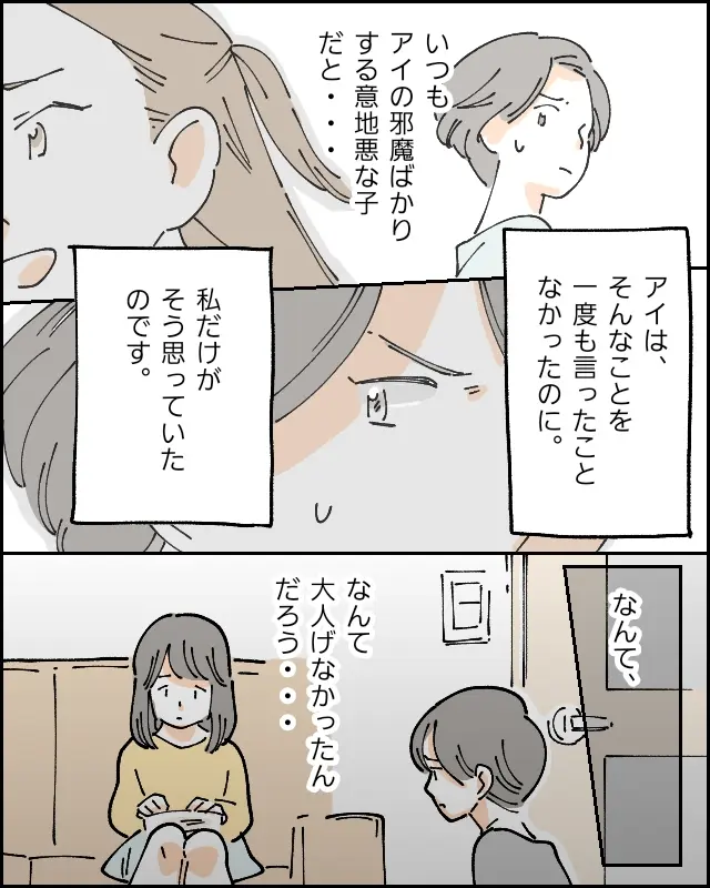 いつもアイの邪魔ばかりする意地悪な子だと・・。アイはそんなことを一度も言ったことなかったのに。私だけがそう思っていたのです。私はなんて・・なんて大人げなかったんだろう・・あまりに情けなくて反省の言葉しか出てきませんでした。
