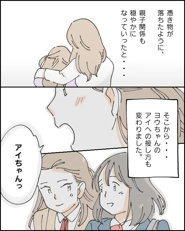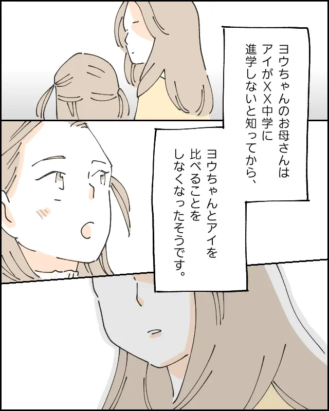 その後、ヨウちゃんのお母さんはアイが××中学に入学しないと知ってから、ヨウちゃんとアイを比べることをしなくなったそうです。