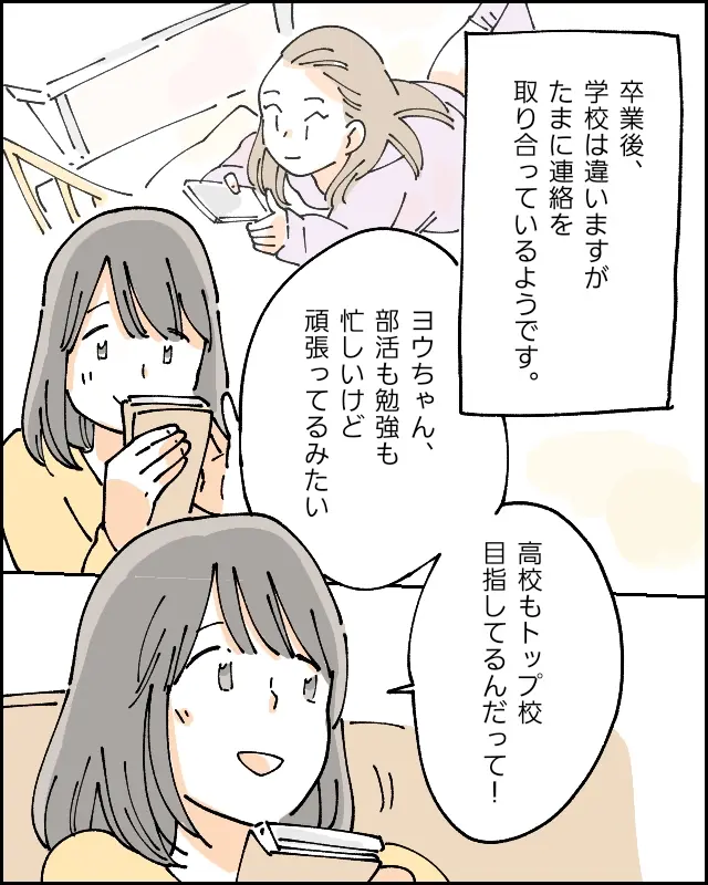 「ヨウちゃん、部活も勉強も忙しいけど頑張ってるみたい。高校もトップ校目指してるんだって!」