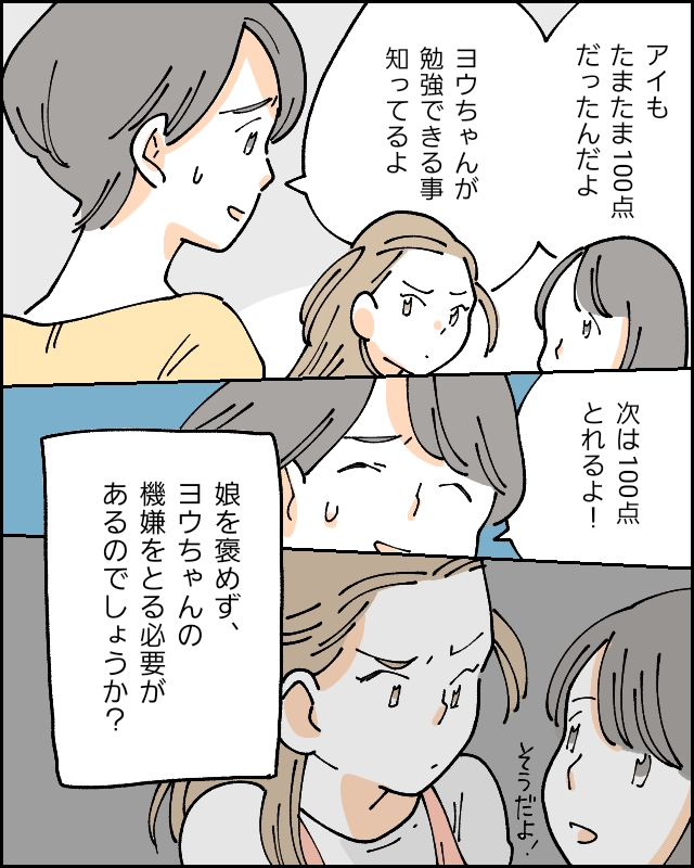 そして、「アイもたまたま100点だったんだよ。ヨウちゃんが勉強できる事知ってるよ」2人の間に入ってそう言った後、「次は100点とれるよ!」と言う私。