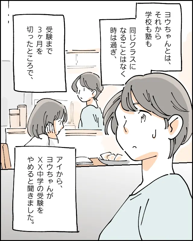 ただ、幸いにもヨウちゃんとは、学校も塾も同じクラスになることなく時が過ぎ、受験まで残り3ヶ月を切った頃、アイから「ヨウちゃんが××中学の受験をやめる」という話を聞きました。