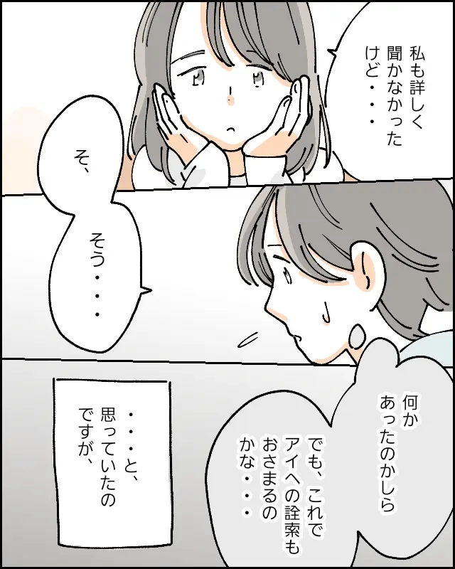 一緒に通っていたそろばん教室を辞めて、ヨウちゃんと会う頻度も少なくなると思っていた矢先、アイから「ヨウちゃんも一緒の塾にしたみたい」と聞かされます。クラスは違うしあまり話していないとアイは言いますが、私は胸騒ぎが止まりませんでした。案の定、小学校ではヨウちゃんによる詮索が始まりました。アイの志望校やテストの点数を聞いては、自分の方がレベルが高いとマウントをとるヨウちゃん。アイはうまくかわしていましたが、私は彼女のデリカシーの無さに苛立ちを感じていました。
