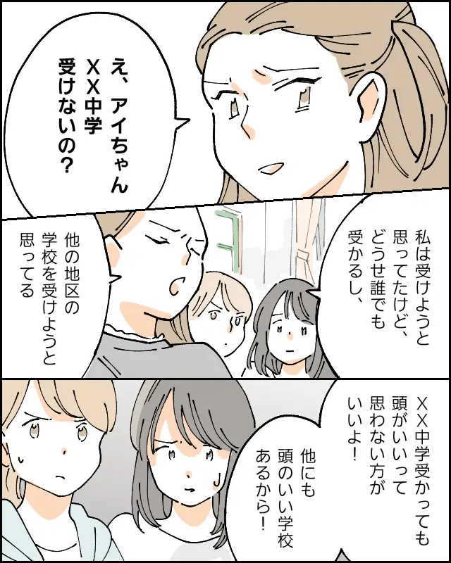 「え、アイちゃん××中学受けないの?」そう言って、馬鹿にしたようにアイを見るヨウちゃん。××中学を受けない理由は、もっとレベルの高い他の学区の中学校を受験しようと思っているからだそう。「××中学受かっても頭がいいって思わない方がいいよ!他にも頭のいい学校あるから!」あからさますぎるマウントに、さすがのアイも少し心を乱されたようです。