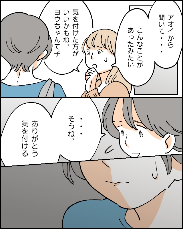 私がこの話を聞いたのは、アオイちゃんママからでした。「アオイから聞いて、気を付けた方がいいかもねヨウちゃんって子」そう言われ、私はうつむきながら「そうね、ありがとう気を付ける」とつぶやきました。