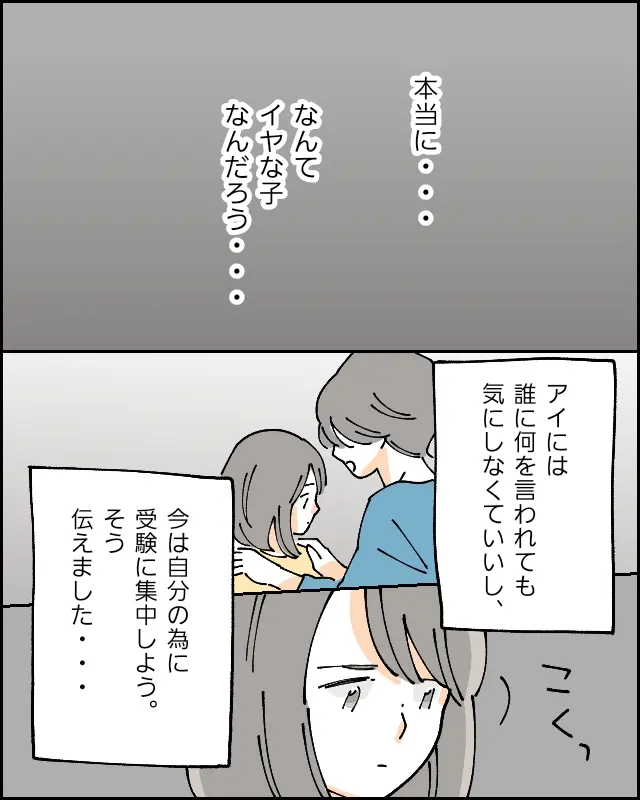 本当に、なんてイヤな子なんだろう。もうすぐ受験が始まるデリケートな時期に、わざと友達の心を揺さぶるようなことを言うなんて・・・。アイには「誰に何を言われても気にしなくていいし、今は自分のために受験に集中しよう」そう伝えました。