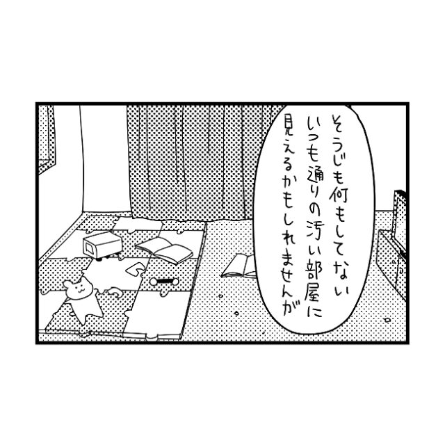本当にその通り!片付けているそばから同時進行で散らかっていく部屋・・・。朝と夜で部屋の中が同じ状態だったとしたら、それはマイナスをゼロにしたということ!パパさんにはぜひとも表面的な部分だけを見るのではなく本質を見抜いてほしいですね。