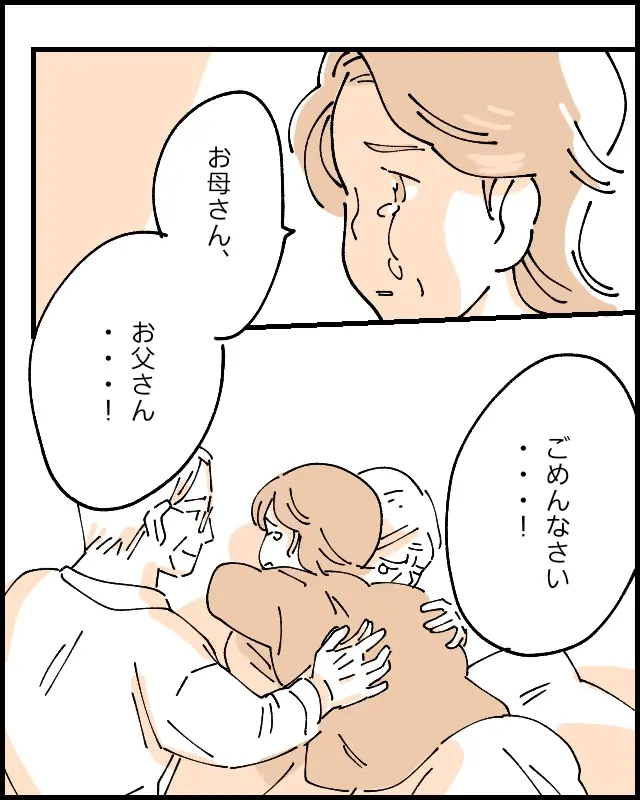 「お母さん、お父さん・・!」そう言いながら駆け寄ると、「ごめんなさい・・!」と謝る史子さんを優しく抱きしめるお母さんとそっと背中に手をあてるお父さん。