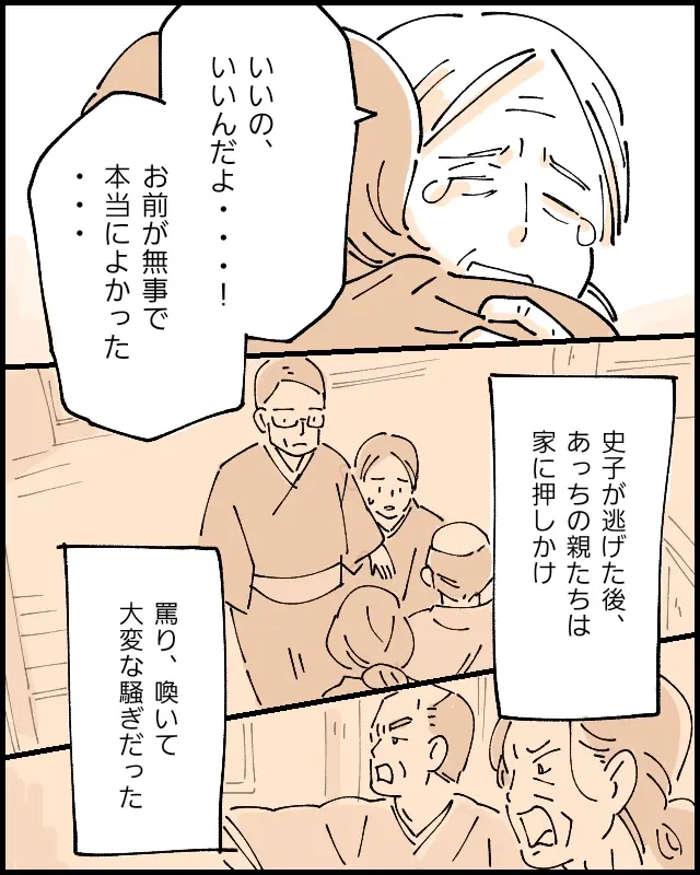 そして、史子さんが許嫁の家から逃げた後、あちらの親たちが実家に押しかけ、罵り、喚いて大変な騒ぎだったと教えてくれました。
