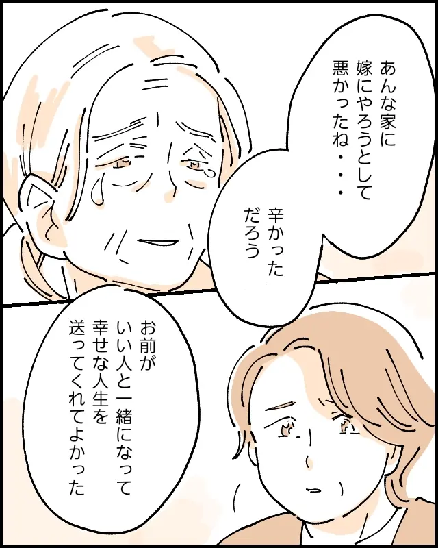 すると、「あんな家に嫁にやろうとして悪かったね・・辛かっただろう。お前がいい人と一緒になって幸せな人生を送ってくれてよかった」そう言って涙を流すお母さんを見た史子さんは、