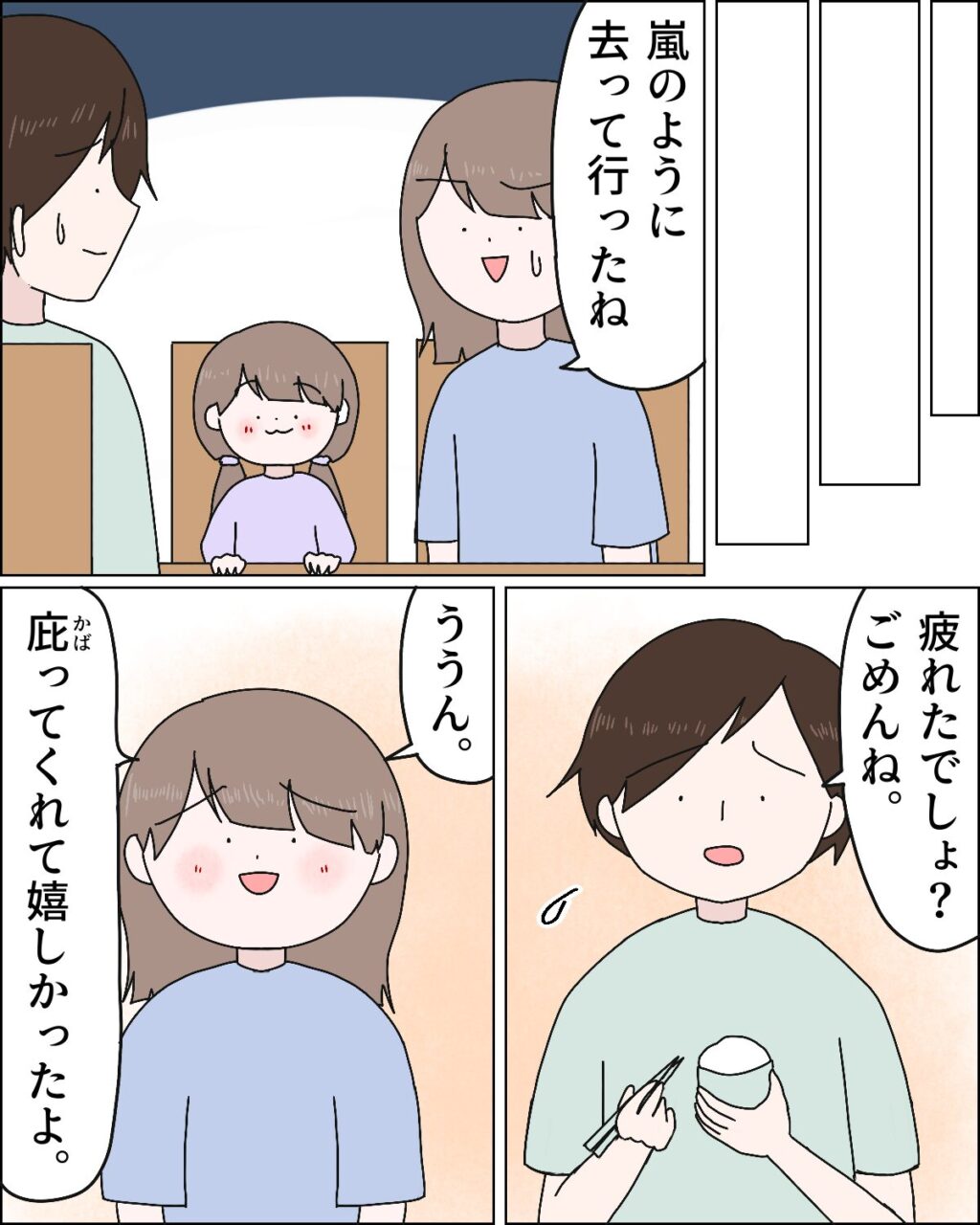 「息子が奥さんに取られた」と怒って帰っていった義母。落ち着いた3人の夕飯の時間が始まりました。「嵐のように去って行ったね」と言うと、ヒロムが「疲れたでしょ?ごめんね。」と申し訳なさそうに言うので「ううん。庇ってくれて嬉しかったよ。」と伝えました。本当に、ヒロムは私の気持ちを全て代弁してくれました。