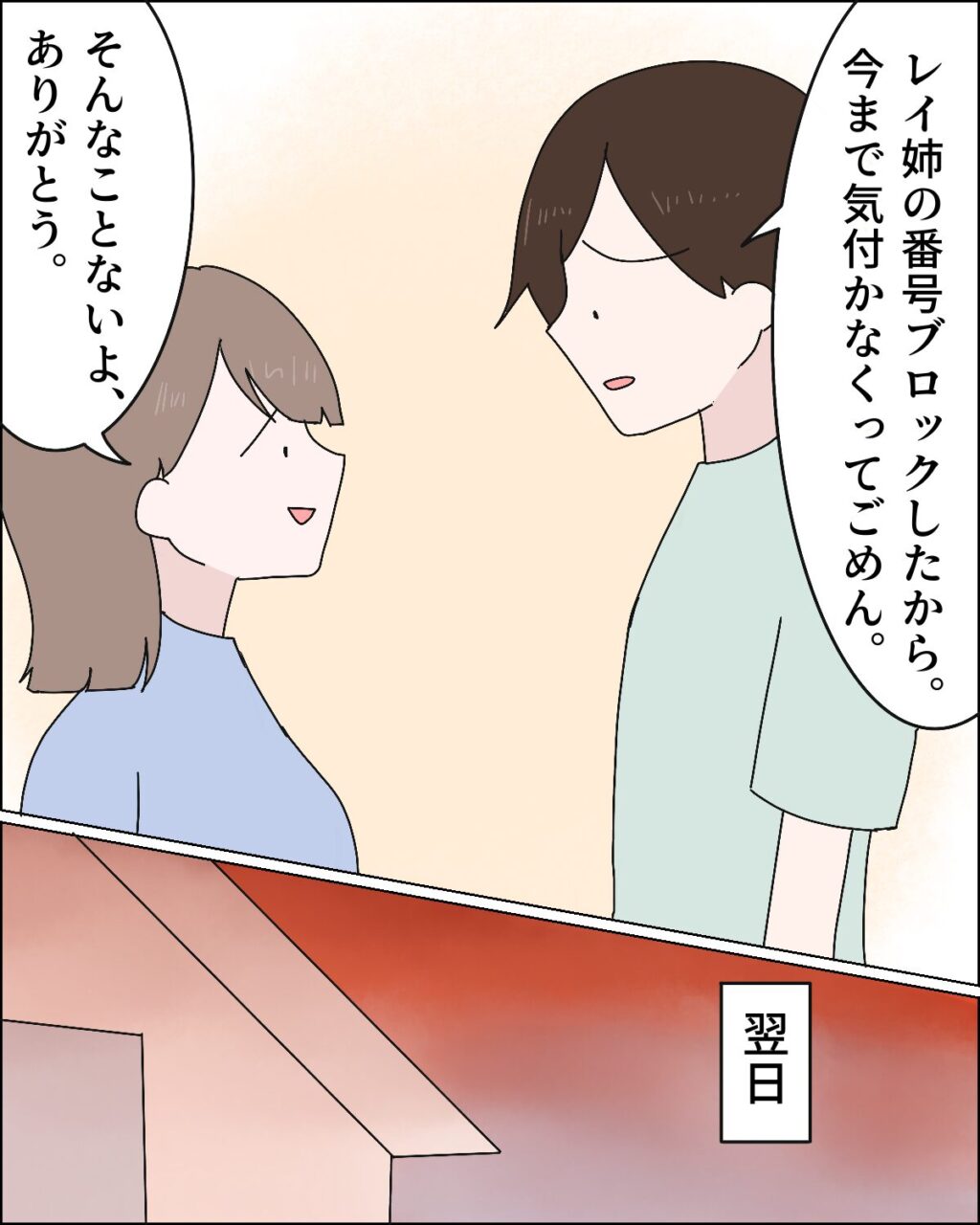「レイ姉の番号ブロックしたから。今まで気づかなくってごめん」ヒロムの言葉に、「そんなことないよ、ありがとう」と答え、翌日へと時間が流れて行きました。