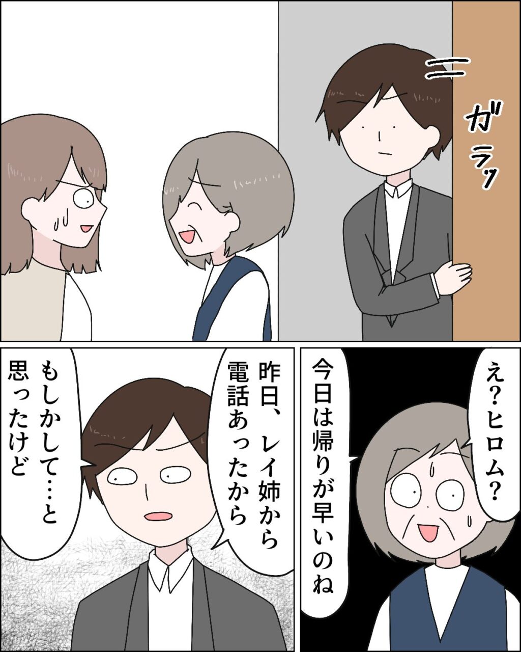 義母の圧に困惑していると、仕事から帰って来たヒロム。すると、「え?ヒロム?今日は帰りが早いのね」と動揺する義母に、「昨日、レイ姉から電話あったから、もしかして・・と思ったけど、」