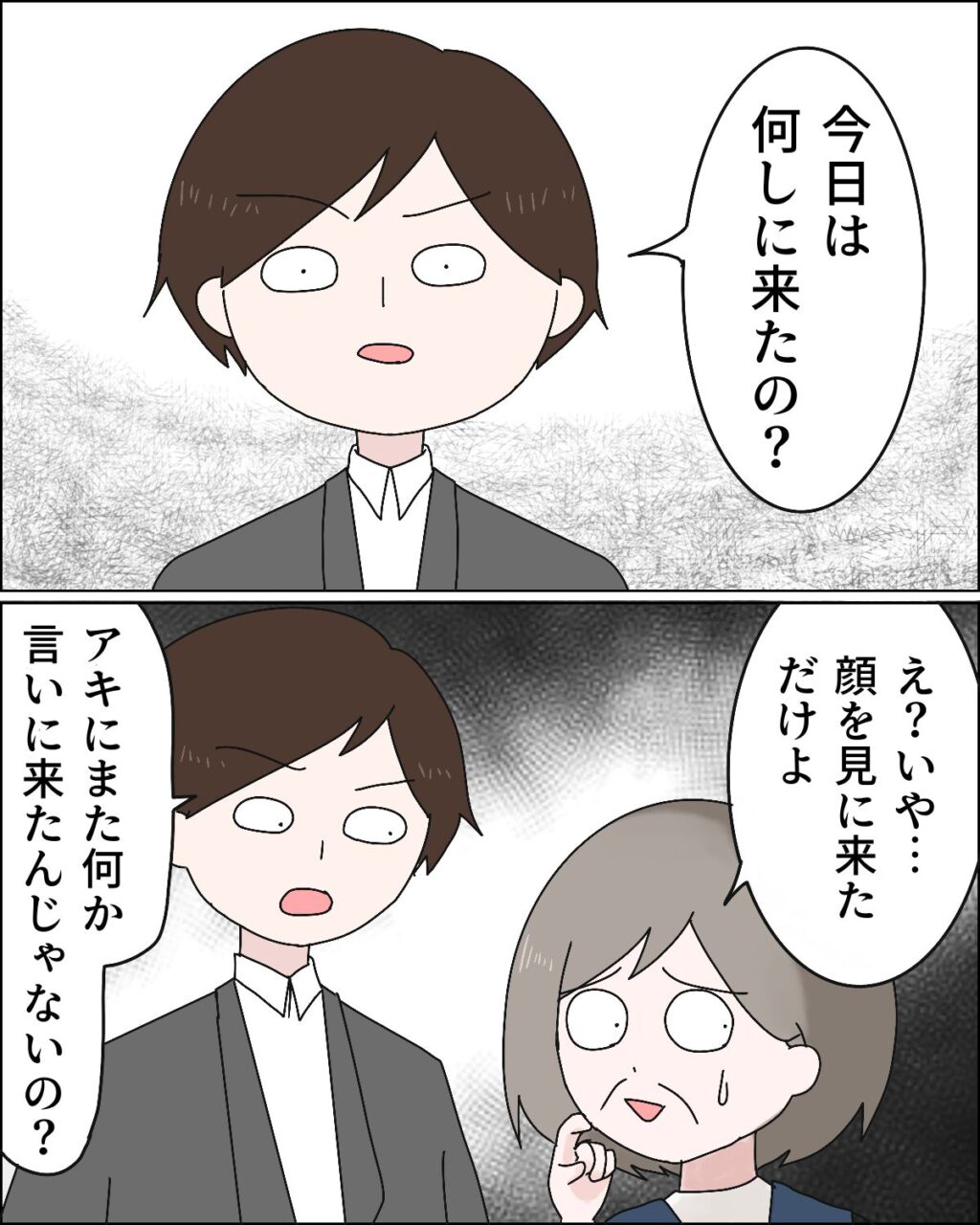 「今日は何しに来たの?」と冷たい目を義母に向けるヒロム。「え?いや・・顔を見に来ただけよ」と義母が答えると、「アキにまた何か言いに来たんじゃないの?」と詰め寄るヒロム。