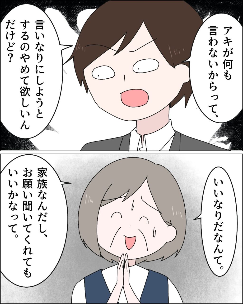 「アキが何も言わないからって、言いなりにしようとするのやめて欲しいんだけど?」ヒロムの言葉に、「言いなりだなんて。家族なんだし、お願い聞いてくれてもいいかなって」としどろもどろで答える義母。
