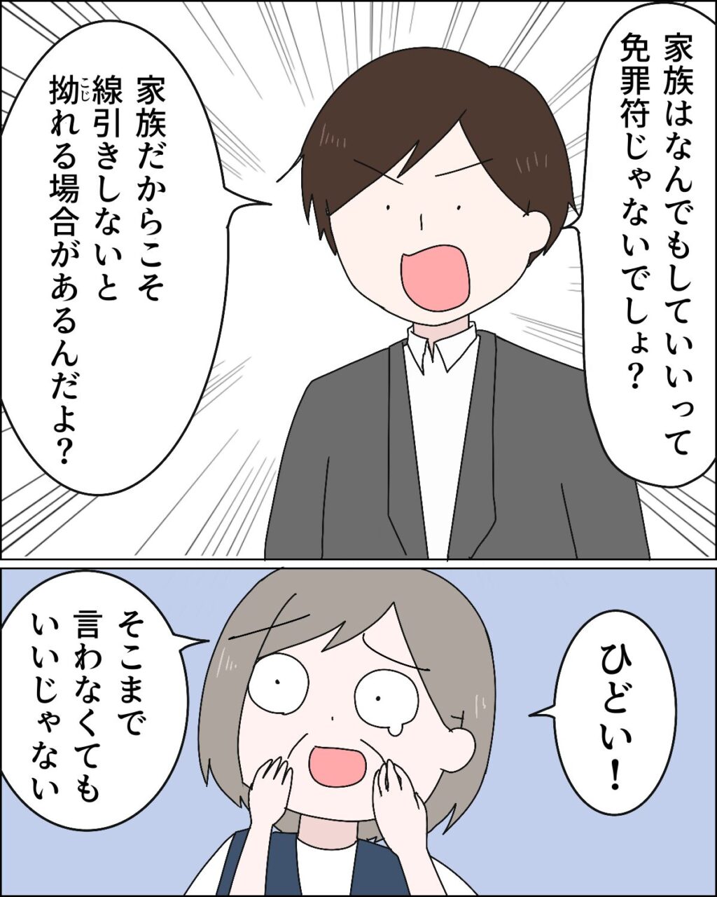 「家族はなんでもしていいって免罪符じゃないでしょ?家族だからこそ、線引きしないと拗れる場合があるんだよ?」ヒロムがそう言うと、「ひどい!そこまで言わなくてもいいじゃない」」義母が目に涙を浮かべてそう言うと、