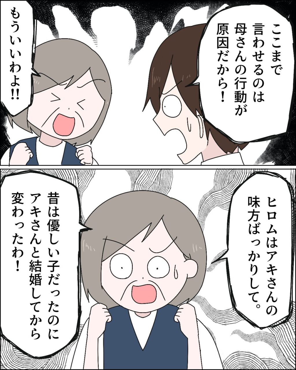 「ここまで言わせるのは母さんの行動が原因だから!」とキッパリ言うヒロムに、「もういいわよ!!ヒロムはアキさんの味方ばっかりして。昔は優しい子だったのに、アキさんと結婚してから変わったわ!」と義母が大きな声で言いました。