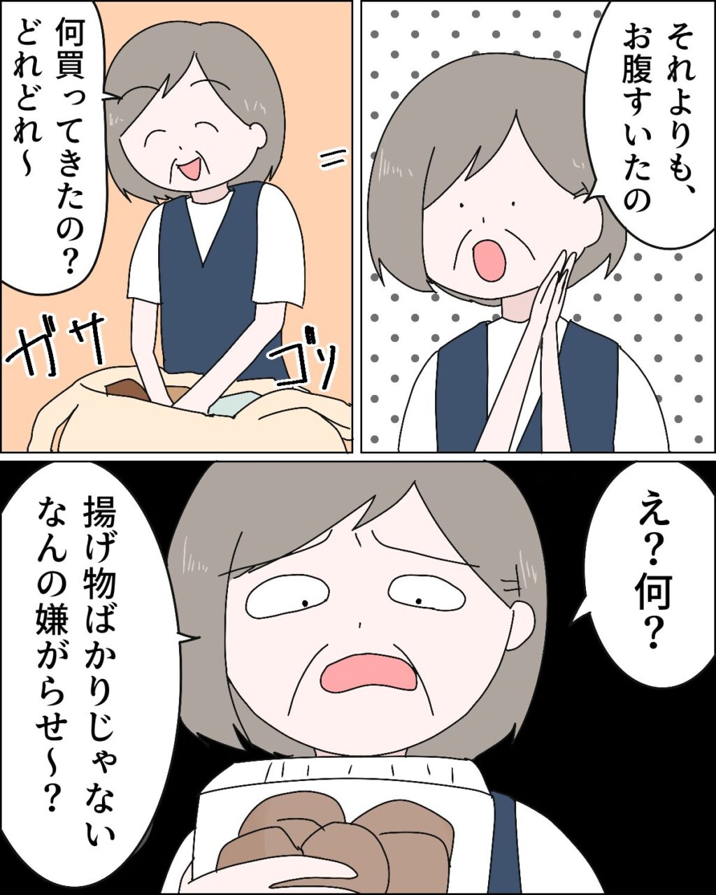予定していたパスタを却下した義母のためにお惣菜を買ってきた私たち。帰宅するや否や、「お腹空いた」と買い物袋を漁る義母が見つけたのは、夫ヒロムが選んだお惣菜です。「え?何?揚げ物ばかりじゃない。なんの嫌がらせ~?」と義母は顔をしかめました。