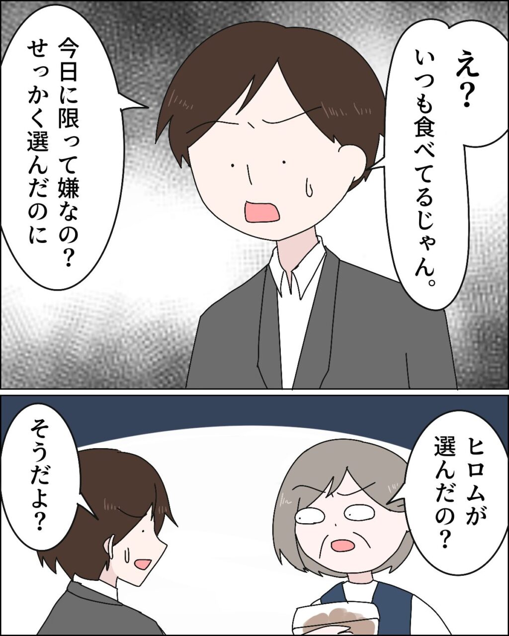 ヒロムが「え?いつも食べてるじゃん。今日に限って嫌なの?せっかく選んだのに。」と言い返すと、義母は「ヒロムが選んだの?」と確認しました。