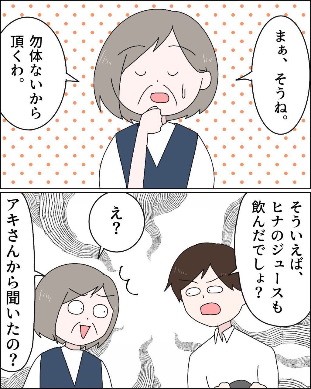 ヒロムが「そういえば、ヒナのジュースも飲んだでしょ?」と義母を責めると、「え?アキさんから聞いたの?」と少し焦った様子の義母。息子には知られたくなかったようです。