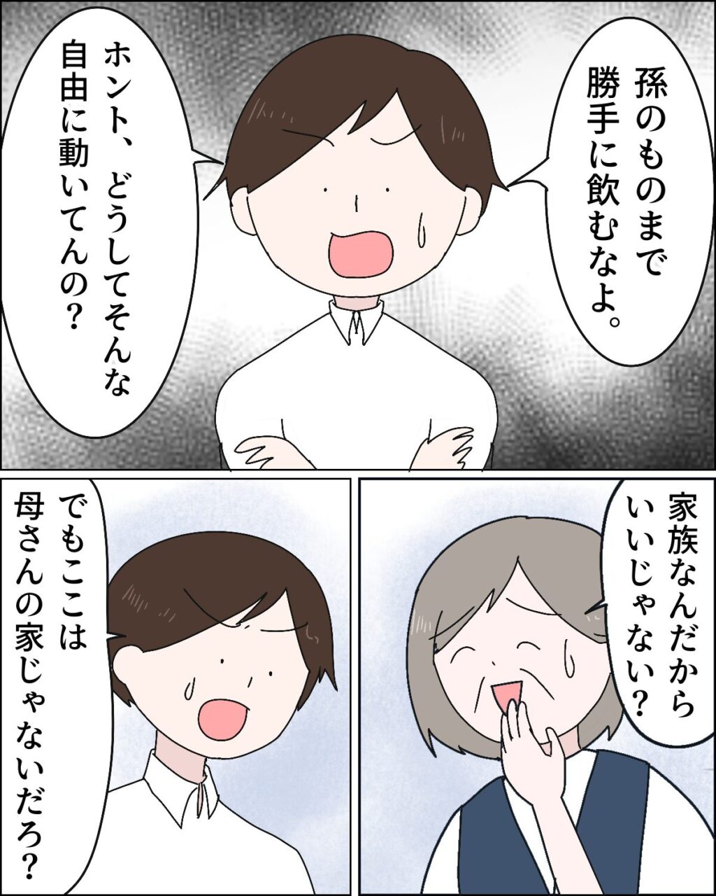 「孫のものまで勝手に飲むなよ。ホント、どうしてそんな自由に動いてんの?」とヒロムにハッキリ言われた義母は「家族なんだからいいじゃない?」と、急に家族を主張してきました。「でもここは母さんの家じゃないだろ?」と、私の気持ちを代弁してくれるヒロムに心の中でそっと感謝しました。