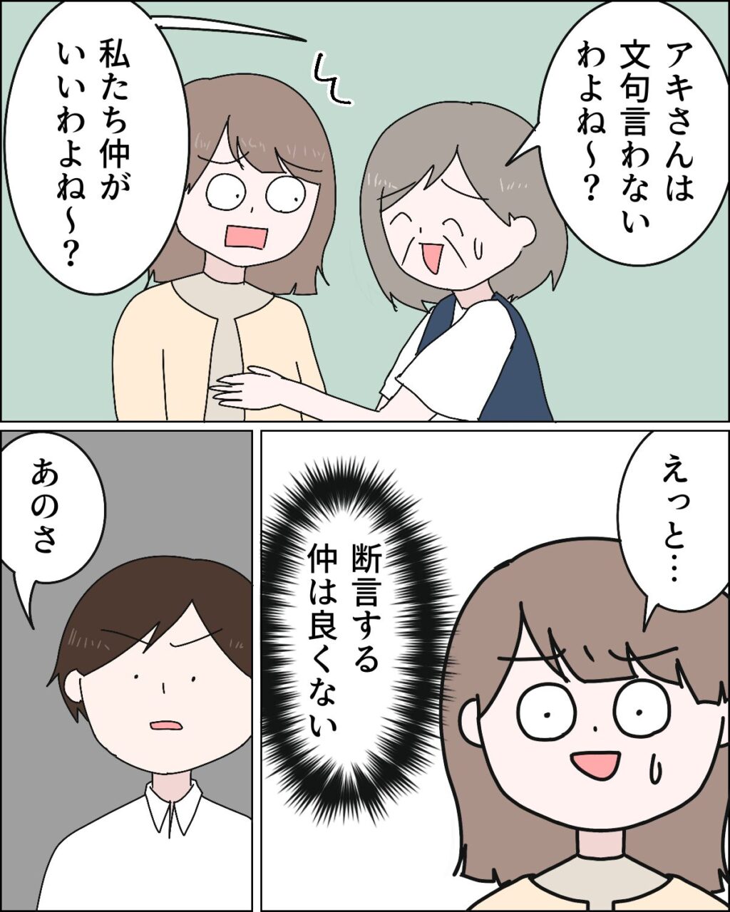 お義母さんはお友達からお嫁さんと仲が良いと聞いて、自分も同じだと信じたいのですね。けれど、普段から自分勝手な行動をされて、仲が良いと思っていないアキさんへの「私たち仲が良いわよね?」の圧が強い質問は困ってしまいますね。
