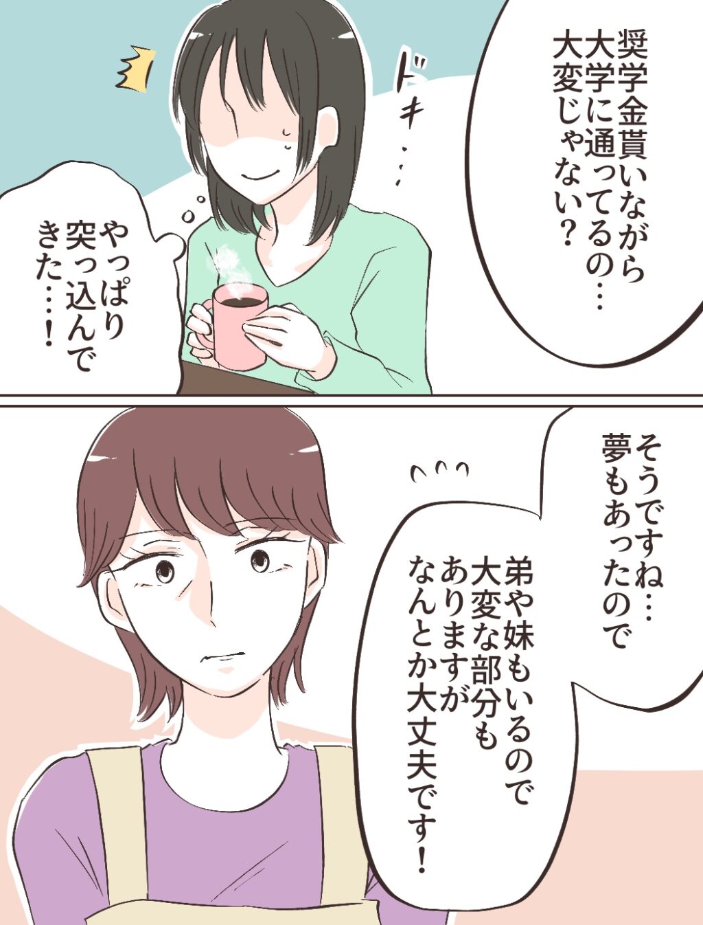 「頑張ってるあなたを否定するつもりはないのよ、でも奨学金って借金でしょ?将来結婚するってなった時に借金のある子と結婚するのは・・・」と、淡々と話すタモツのお母さん。今日家に招かれたのは、この話をするためだったんだ・・・と思いました。
