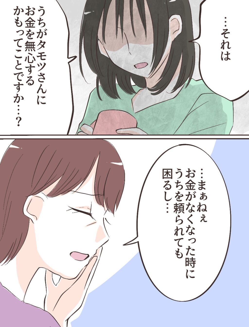 何も言えないまま固まる私に、「学費を出すのは親の役目、それができない家庭だと、将来タモツが負担せざるを得なくなるんじゃないかと心配で」と続けるタモツのお母さん。自分の夢を叶えるために、親に迷惑をかけないように借りた奨学金が、将来タモツの負担になるかもしれないと心配する気持ちは分かりますが、それと私の実家の経済状況とは何の関係もないはずです。
