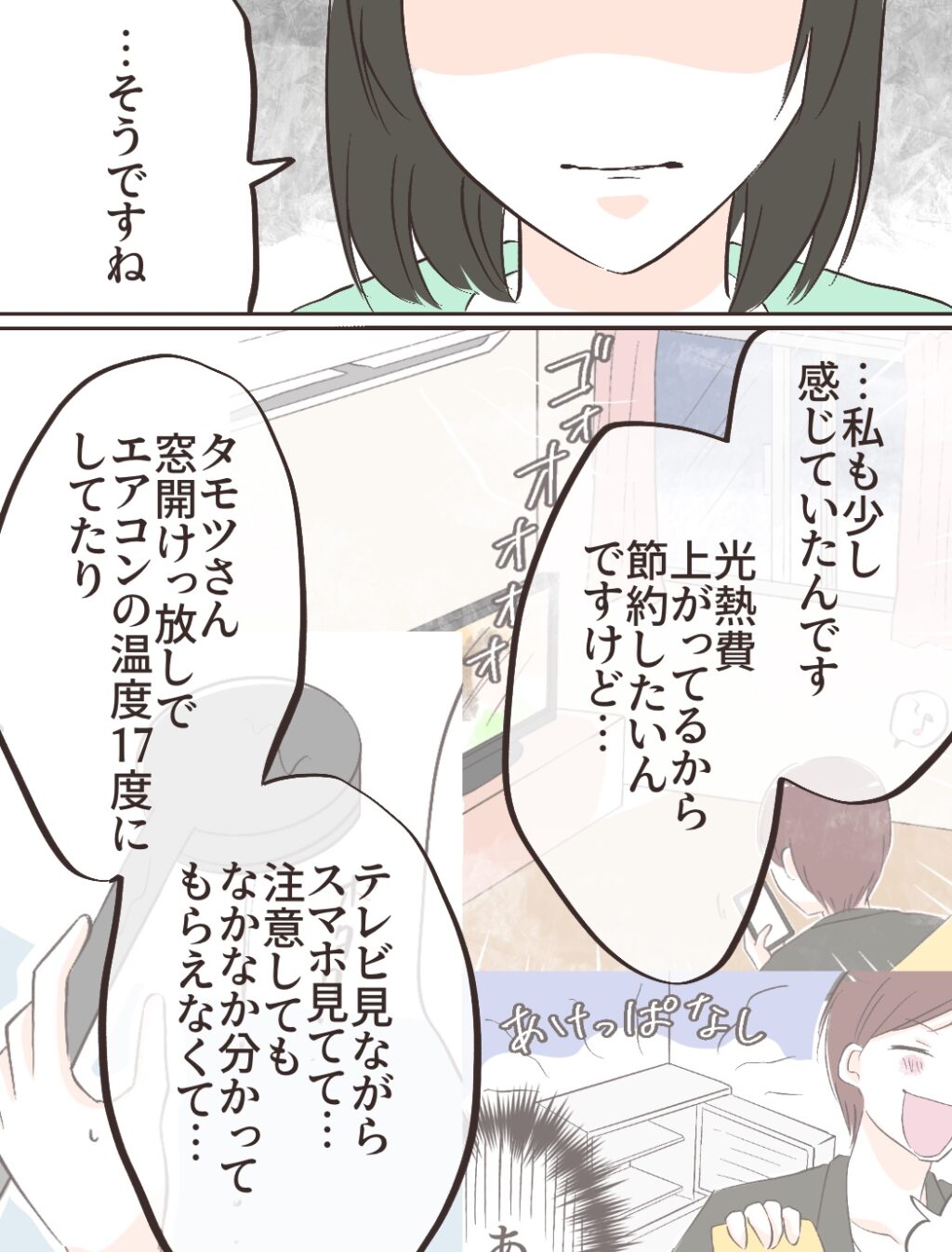 悔しさや悲しさ、そして怒りを抑えて、私はタモツと節約の価値観が全く違うことには同意見だと言いました。そして光熱費が上がっているから節約して苦手も、タモツは窓を解放したままエアコンを17度設定でつけたり、テレビをつけっぱなしでスマホに夢中だったり、伝えても分かってもらえなかったことをお母さんに伝えました。
