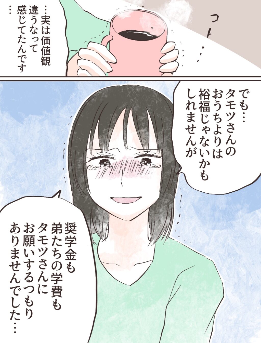 タモツのお母さんが家に招待してくれたけれど、挨拶の時から奨学金や一人暮らしの食生活のことを聞かれたので、なんとなく予想はできていたけれどやっぱりお母さんは私のことをお金に困っている子、と感じていたようです。学費を出す責任を果たせない親、そしてタモツと結婚したらお金を無心するかもしれないなどと、思ってもいないような酷いことを言われて私は固まってしまいました。