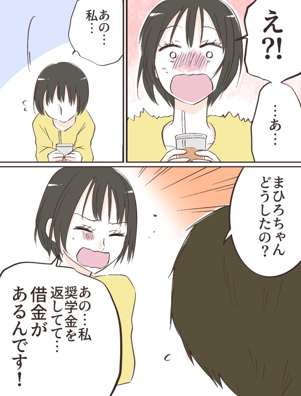 「え!?・・あ・・あの・・私・・」動揺していると、「まひろちゃんどうしたの?」と聞かれ、「あの・・私奨学金を返してて・・借金があるんです!」と思い切って告白すると、