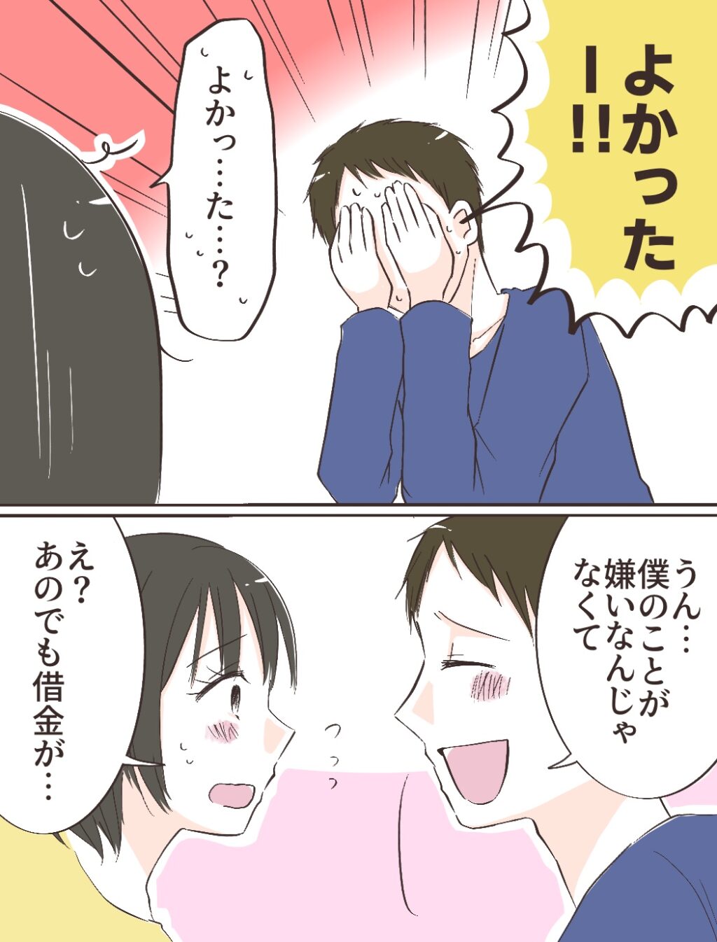 「よかったー!!」と嬉しそうに言って顔を覆い出すのを見て、「よかっ・・た・・?」と不思議そうに言うと、「うん・・僕のことが嫌いなんじゃなくて」と笑顔で言われ、「え?あのでも借金が・・」とまた言うと、