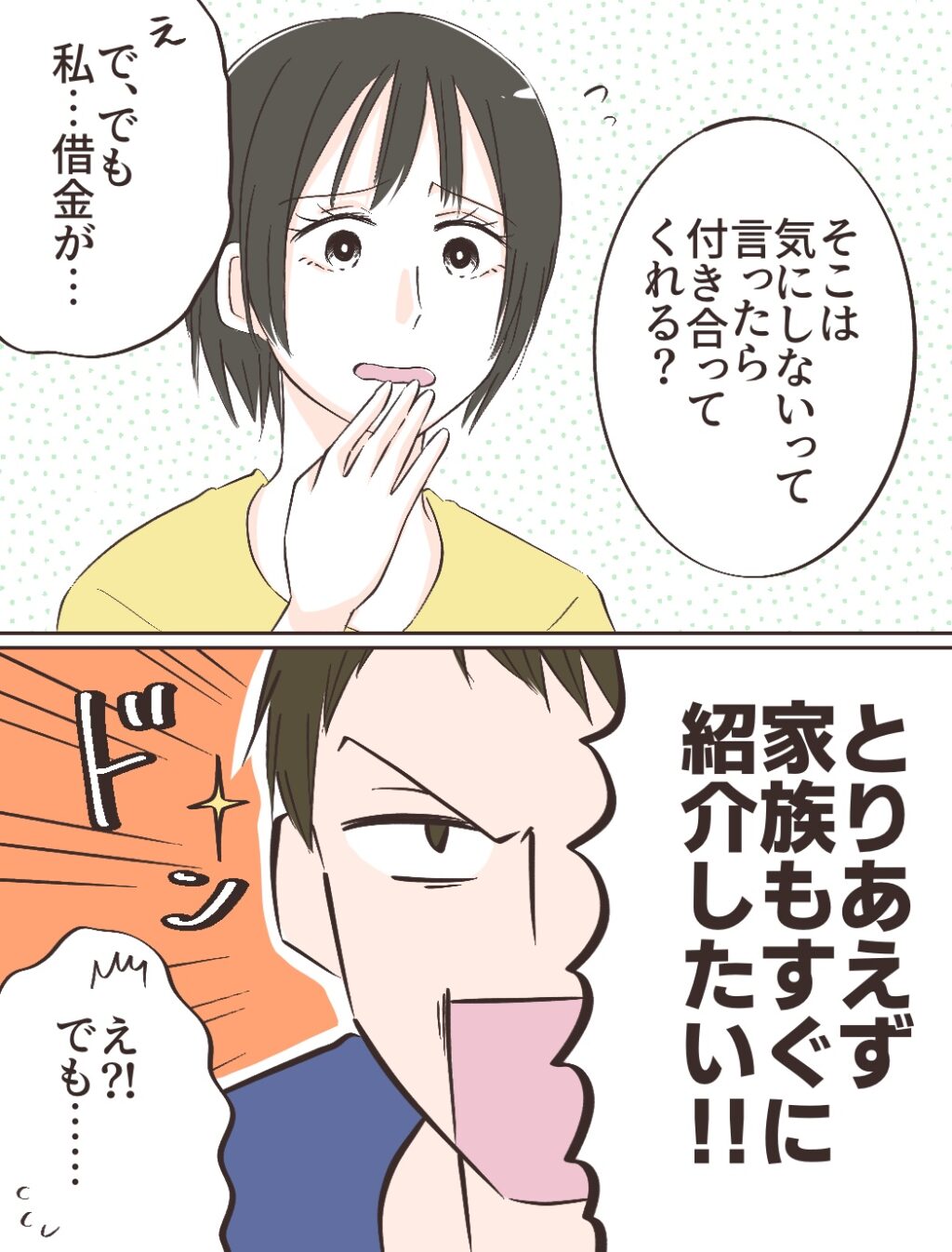 「そこは気にしないって言ったら付き合ってくれる?」と言われ、「え、で、でも私・・借金が・・」とどうしても気になってそう言うと、「とりあえず家族もすぐに紹介したい!!」とヨウスケは行け行け状態!私は「え!?でも・・」と奨学金のことが気になって仕方ありませんでした。
