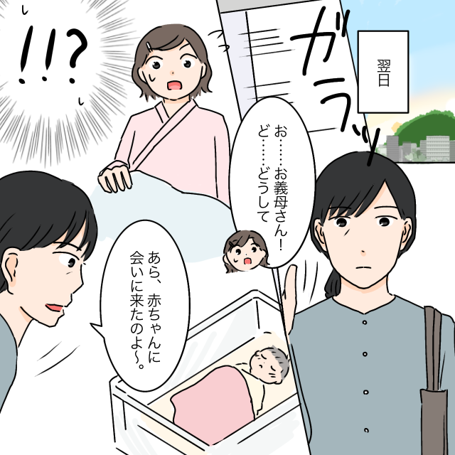 ガラッと病室のドアが開くと・・義母が!「お・・お義母さん!ど・・どうして」と驚く私に、「あら、赤ちゃんに会いに来たのよ~」と平然と言い、寝ているカノンの顔を覗き込みました。
