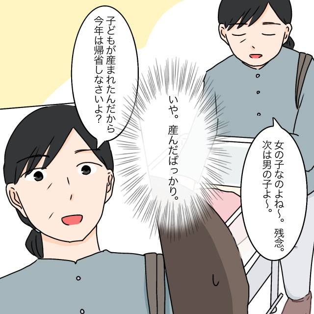 「女の子なのよね~。残念。次は男の子よ~」と言い出す義母に、「いや。産んだばっかり」と心の中で呟くと、「子どもが産まれたんだから今年は帰省しなさいよ?」と義母。