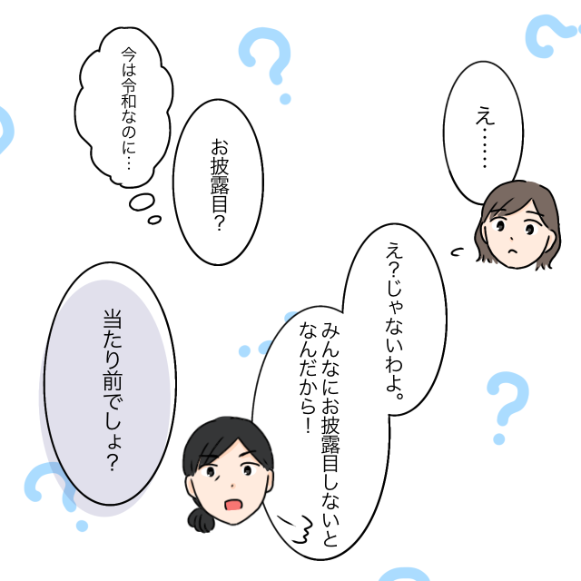 「え・・」と言うと、「え?じゃないわよ。みんなにお披露目しないとなんだから!」と言い切る義母。「お披露目?」とたずねながら、「今は令和なのに・・」と心の中ではモヤモヤ。でも義母は、「当たり前でしょ?」と言い放ちました。