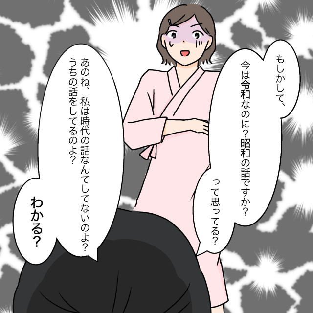 そして、「もしかして、『今は令和なのに?昭和の話ですか?』って思ってる?」と義母に言われてギクリ。さらに、「あのね、私は時代の話なんてしてないのよ?うちの話をしてるのよ?わかる?」と出産したばかりの私に詰め寄りました。