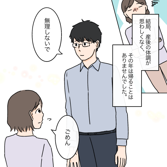 連絡もせず突然やって来た義母に「急に来ても迷惑だろ?」と夫が言うも、平然と「孫を見に来てくれたんだ!ありがとう、でしょ?」と開き直る義母に「帰って」と詰め寄りました。言い合いの末帰ろうとする義母を送って行くと部屋を出て行った二人。やっと静かになった部屋で「こういう義母って、マンガだけの話かと思ってた」と呟きながら、カノンを抱っこした私は、結局、産後の体調が思わしくなく、その年は帰ることはなく、「無理しないで」と労わってくれる夫に「ごめん」と謝りました。