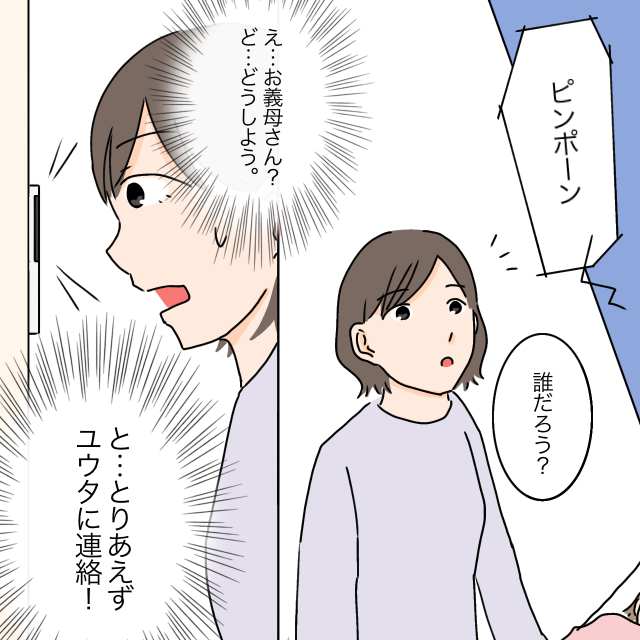「誰だろう?」そう思いモニターをのぞくと、「え・・お義母さん?ど・・どうしよう。と・・とりあえずユウタに連絡!」と動揺する私。