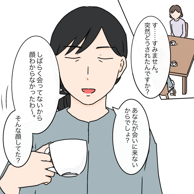 部屋に通し、お茶を出してから、「す・・すみません。突然どうされたんですか?」とたずねると、「あなたが会いに来ないからでしょ?しばらく会ってないから顔わからなかったわ~。そんな顔してた?」と義母に言われました。