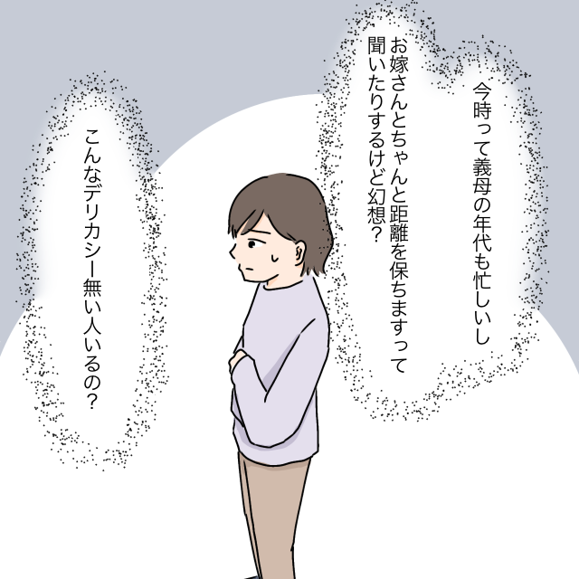 今時って義母の年代も忙しいし、お嫁さんとちゃんと距離を保ちますって聞いたりするけど幻想?こんなデリカシー無い人いるの?」と考え込んでしまいました。