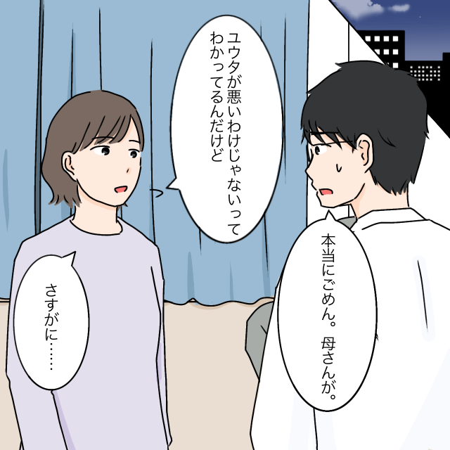 その夜、「本当にごめん。母さんが」と夫に謝られ、「ユウタが悪いわけじゃないってわかってるんだけど、さすがに・・」と思わずもらす私。