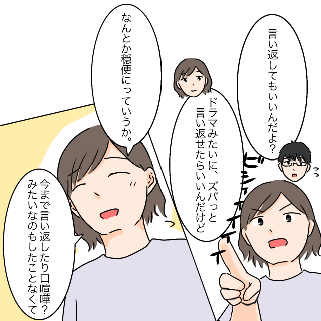 すると、「言い返してもいいんだよ?」夫にそう言われ、「ドラマみたいにズバッと言い返せたらいいんだけど、なんとか穏便にっていうか。今まで言い返したり口喧嘩?みたいなのもしたことなくて」