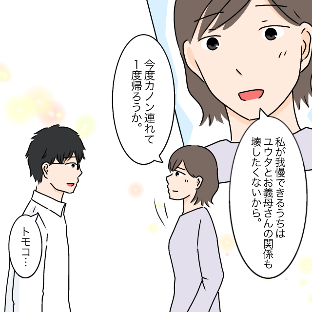 「私が我慢できるうちはユウタとお義母さんの関係も壊したくないから。今度カノン連れて1度帰ろうか」私の言葉に、「トモコ・・」と夫が嬉しそうに言いました。