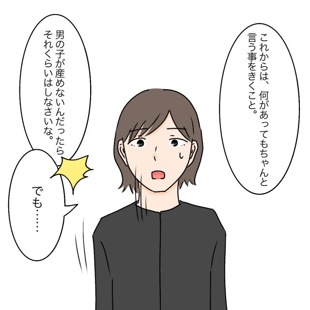「これからは、何があってもちゃんと言う事をきくこと。男の子が産めないんだったらそれくらいはしなさいな」そう言われて「でも・・」と反論しようとすると、