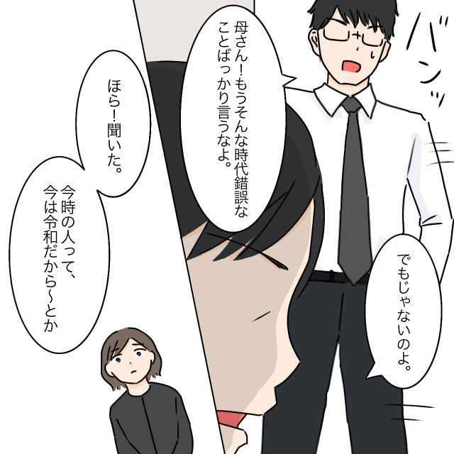 「でもじゃないのよ」と厳しい顔をする義母に、「母さん!もうそんな時代錯誤なことばっかり言うなよ」夫がそう言うと、「ほら!聞いた?今時の人って、今は令和だから~とか」、
