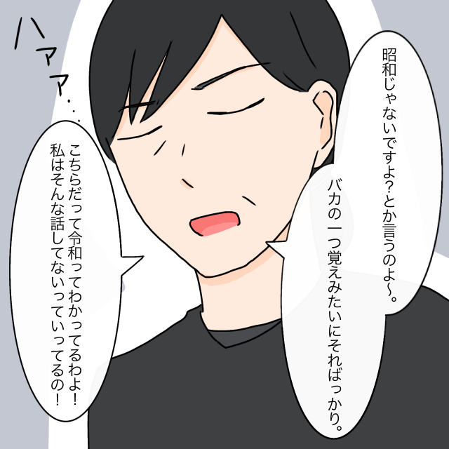 「昭和じゃないですよ?とか言うのよ~。バカの一つ覚えみたいにそればっかり。こちらだって令和ってわかってるわよ!私はそんな話してないっていってるの!」と義母が言い、