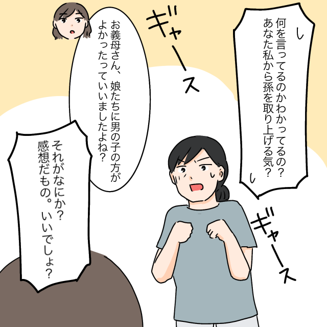 「何を言ってるのかわかってるの?あなた私から孫を取り上げる気?」孫と二度と会えない、そう言われて焦ったのかますます声を荒げる義母。私は冷静に「お義母さん、娘たちに男の子の方がよかったって言いましたよね?」と聞きます。すると義母は開き直って「それがなにか?感想だもの、いいでしょ?」と言いました。