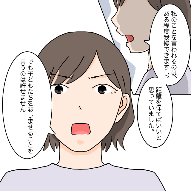 感想だからって言っていい事と悪い事がある・・・私は義母の目をしっかりと見つめて「私のことを言われるのはある程度我慢できますし、距離を保てばいいと思っていました・・・でも子どもたちを悲しませることを言うのは許せません!」と言いました。